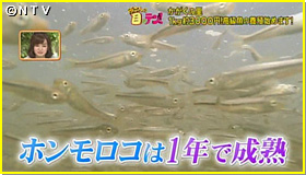 たどり着いたのは島根県益田市。ホンモロコの養殖をしている山根さん。養殖場は、50平米の生け簀に全部でおよそ1万匹のホンモロコを養殖しています。山根さんは、6年前、元々100匹のホンモロコから養殖を始め、あっという間に100倍に!実はモロコという名は、子だくさんと言う意味。1回の出産でおよそ200個卵を産みます。5月は産卵して孵化させる時期ということで卵と稚魚を見せて頂きました。自然の中では水草などに産み付ける直径1mm程度の卵。5,6日で孵化します。小さいうちのエサはプランクトン。鶏糞などを入れ、微生物の多い生け簀で、大きくするんだそう。かがくの里の池にホンモロコを放流すればどじょうと同じく、田んぼに水をはった頃にパイプを伝い田んぼへ移動。