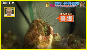 岩などにくっつき、固い殻に覆われている生き物「フジツボ」は、実はエビやカニと同じ甲殻類なんです。殻の上部からほうきの先のようなものを出しています。これは蔓脚と呼ばれるモノで、エビやカニで言う足の部分にあたります。殻の中では、頭部、胸部、脚部と分かれ底に体をつけて、足でエサを捕らえているんです。地味な見た目ではありますが、その生態は、とっても不思議に満ちているんです!所さんもフジツボの餌付けに挑戦しました。