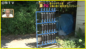 川村先生は、「これは、ペットボトル温水タワーすだれ太陽光の熱を当てて温水を作ると。それで裏側はすだれになっているから快適」だと言います。黒く塗った2リットルのペットボトルが24本取り付けられただけのシンプルな装置。ホースをパイプに繋ぎ、ペットボトルに水を入れます。阿部さんが農作業をしていた3時間、太陽の下に置いておくだけで、お湯ができちゃうそうです。最初に入れた水の温度は23度。3時間でなんと38度になりました。夏のシャワーには十分な温度です!去年、作った露天風呂へ装置を移動させて、さっそく作業着を脱いで、太陽熱シャワー!そして肝心のジャガイモは…なんと5品種合計で100kg程度収穫できたそうです!