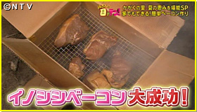 その切れ込みにこんな風に焼き網を通せば完成。次に用意するのは、燻製用のスモークウッド。火は出ずに煙だけが出るもので、ホームセンターなどで簡単に手に入るそうです。イノシシの獣臭さを消すための香りづけとして、香りの強いピートパウダーをふりかけ、その上に燻製器をセットします。後は、肉を並べてじっくりスモークするだけ。待つこと2時間…イノシシのベーコンが完成!ベーコンにすることで、日持ちもよくなり、旨みもぎゅっと凝縮します。
