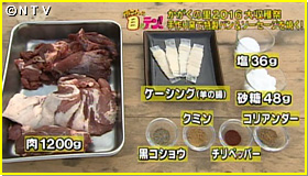 そして、猟友会の方に地元でとれたイノシシ肉を分けていただき、野生のイノシシ肉を使ったソーセージを露久保先生に作ってもらいました!その下ごしらえは、イノシシの肉を細かく切り、塩をよくもみこんでから2時間寝かせます。塩がなじんだところで、お肉に砂糖、スパイスを加えます。これをフードプロセッサーでミンチにしていくんですが、露久保先生によると、その時に氷を入れるのがポイントだそう。お肉と油と水分が低温で混ざり合うと、熱を加えたときプリプリになるんです。これを絞り袋に詰め、羊などの腸に流し込むケーシングという作業。これを食べやすい大きさにねじってお湯で50分茹でます。これは殺菌のためですが、お湯の温度は80度を越えてはダメ。高温で加熱すると、肉の油がとけ、食感がボソボソになっちゃうんです。こうして茹で上がったソーセージをパンと一緒に釜で焼いてついに完成!所さんや松村先生も大満足でした。