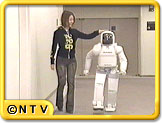 「うおずみさ〜ん、コンニチハァ〜 」というかわいらしい声にびっくりして振り向くと、大きさ的には恐らくドラえもんくらいのアシモ君が、私の名を呼んで立っていた。「か、かわいい…」その愛らしさにぼう然と立ち尽くしていると、「お忙しいナカお越しいただき、ありがとうございマス。あちらがプレスルームになります。ご案内いたします。右に曲がります…」としゃべりながら部屋まで廊下を歩きつつ案内してくれた。スンナリしゃべるし、ふつーに歩くし、身振りもけっこう自然にできている。「ホォー」深く感心しながら、アシモ君の目をのぞきこんでみた。「ん?何ですか?」オオッ!こんなことまで反応するのかっっ。