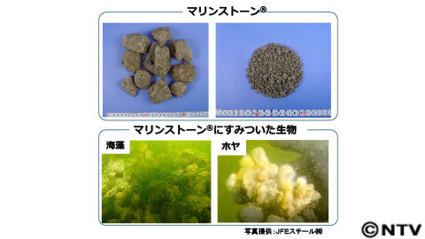 他にも、この製品の表面やすきまが、海底の生き物のすみかとなるため、二枚貝やホヤなど、濁った海水を濾(こ)しとってキレイにする力を持つと言われる生き物がすみやすくなるというメリットもあるんです。