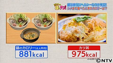 そこで、ごはんやみそ汁、一般的なおかずなどのメニューを、先ほどの4人にそれぞれ満腹と感じるまで食べてもらい、その時の血糖値を測定し、変化を観察。すると…食べ始めと共に、血糖値はぐんぐん上昇し、食後から2時間後も高い数値を示しました。一方、鍋を食べた時の変化を見てみると…食べ始めてからずっと、血糖値が緩やかに上昇し、数値も先ほどより低いまま。つまり、鍋はインスリンが分泌されにくく、太りにくい料理だったんです。では、なぜこんなにも違いが表れたのでしょうか?柳澤先生は「鍋の材料になる野菜やきのこ、豆腐などはなかなか血糖値を上げない。血糖値が上がらないと満腹中枢が刺激されずついつい多く食べる。でも、鍋に使う食材の多くは低エネルギーなので、結果的に、食べる総エネルギーが抑えられる。さらにシメを食べても、低エネルギーの食材のみでお腹は十分に膨れているので、それほど量を食べることなく満腹感を得られる」と解説。その結果、鍋は全体的に低エネルギーで済むという料理、という事が言えるとのこと。