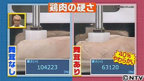 舞茸に含まれる酵素が、生の鶏肉の筋繊維のタンパク質を分解。一度分解された筋繊維は、加熱してももとには戻らないため、煮てもやわらかく仕上がるんだそうです。そこで、下ごしらえをしていない鶏肉と、舞茸と混ぜて下ごしらえした鶏肉を煮て…その違いを比較。すると…下ごしらえをした方が、明らかに柔らかくなったんです!さらに、それぞれの柔らかさを機械で計測してみると…舞茸と混ぜた鶏肉のほうが、およそ40%も柔らかかったんです。
