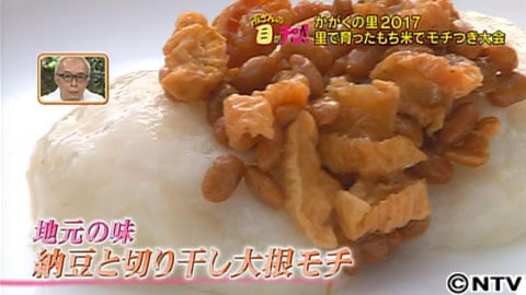 お餅の味付けは、定番のきな粉やあんこ。そして調理科学の専門家、露久保先生のおすすめが「くるみダレ」。東北地方の岩手県でもよく食べられる方法で、くるみをすりつぶして、砂糖と塩と醤油で味付け。とろみを出すためにお水を加えて、丁度いい硬さにして食べます。さらに、まず茨城名物、納豆と切り干し大根を混ぜた地元の味も!地元の子どもたちと美味しくいただきました。