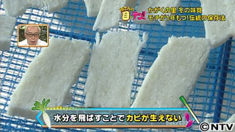 それから1週間。お餅の残りはこのままだとすぐに、カビが生えてしまいますが、実は1年程度、保存できる科学的な調理法があるんです。まず四角い形にして保存しておいたお餅を、薄く切っていきます。これを冬の乾燥した時期に、干しカゴに並べ風通しの良い場所で、3、4日干すだけ。完全に水分を飛ばすことで、カビが生えないんです!これを食べる直前に、揚げたり焼いたりして「おかき」にして頂きます。