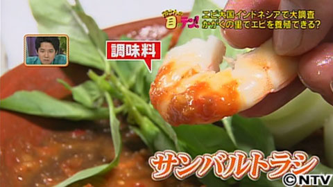 市場近くのレストランで現地の食べ方を調査すると、茹でたり、揚げたり、炒めたり、色んな食べ方をしていますが、エビを知り尽くすインドネシアならではのものがサンバルトラシという調味料。トラシとは小エビを発酵させペーストにしたもの。ここに大量の唐辛子などを混ぜてできる超激辛ソース!適量なら、エビのコクを楽しめる伝統的な美味しい調味料です!