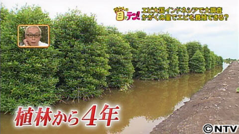 池の中に点々と植えられているマングローブ。これが4年でこんなに立派に成長。そもそもマングローブとは、海水と淡水が入り混じった汽水域に生える植物の総称です。実は阿久根さんたち、かつて集約養殖がおこなわれ水質が悪くなり放棄された土地にマングローブを植えていたんです。マングローブは海水から集約養殖によって増えすぎた栄養を吸い上げ成長。土地を健康な状態に戻してくれるという浄化作用があるんです!さらに、この養殖では、植林したマングローブを囲い込むような形で水路が作られています。マングローブの落ち葉が水路に入り、それを分解する微生物が集まって、プランクトンが増えます。つまり人がエサを与えなくても、自然の循環の中でエビが育つシステム。人の手で自然循環を生み出すこの方法で伝統養殖の2倍の収穫が期待できるそうです!ここで育ったエビは、エサをあげていないのに立派で元気!まさにマングローブの恵みです。