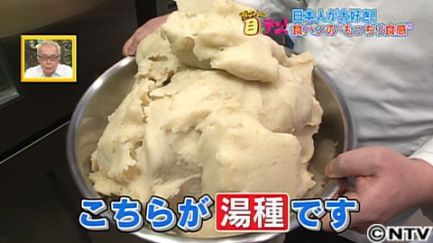 それが…“湯種製法”。普通のパン生地は、小麦粉と水を混ぜ合わせて作りますが、湯種は、熱湯と小麦粉をよく混ぜ合わせて作ります。糊のような少しねばねばしたものが湯種です。普通の生地に、この湯種を2割ほど入れ食パンを作ります。