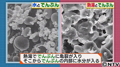 顕微鏡で、小麦粉に含まれるでんぷんを見てみると…水で混ぜたでんぷんは、粒が残っているのに対し、熱湯で混ぜた方は、粒が変形しています。熱湯により、でんぷんに亀裂が入りその亀裂部分から内部にも水が入ったので、水分量の多い、もっちり食感のパンになったんです!