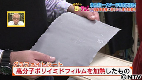 その素材というのが、「高分子ポリイミドフィルム」と呼ばれる、耐熱性の特殊なシート!実はこれ、人工衛星のはやぶさにも使われているそうなんです。このフィルムを加工しヒーターに使用します。ポリイミドフィルムを高温で焼くと…グラファイトシートという全く違う性質のものになり、ヒーターの材料として優れた要素を持つようになります。