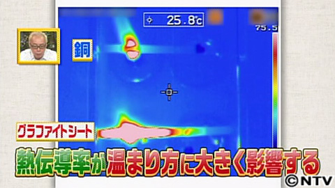さらに…電気を通す際に発生した熱を素早く熱源全体に伝えることができるため、瞬時に温まるんです。では、どのくらい熱伝導率が高いのか…鉄よりも熱伝導率が良い、銅とグラファイトシートで比較実験。