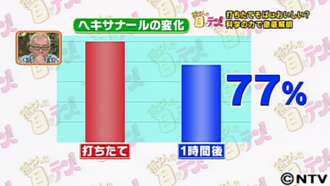 そこで、そばの香りのもとであるヘキサナールの量がそば打ちの後、どのくらいの時間でどれだけ変化すのか計測してみました。すると…打ち立てのヘキサナールの量を100%とした場合、わずか1時間後に77%に減少!そばの香りは、打ち立てじゃないと減ってしまうことがわかったんです。ヘキサナールの量が打ちたてから時間がたつに連れてどんどん揮発して少なくなっていくため、「打ちたての日本そばは美味しい」と言われるようになったんです。