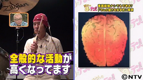 すると、練習を始めたばかりの時には平常時とあまり変わらない活動をしていた脳が、「ヘイ・ジュード」に合わせて叩いているときは、脳全体が活発に活動を開始。辻下教授によると、これはドーパミンという楽しさを感じたときに出るホルモンが脳に分泌されて、喜びが満ち溢れていることを意味しているんだそう。快楽が記憶に残ると、「またやりたい」という気持ちになるため、このような脳の活動がでることが継続を促す要因になってくると言うんです。