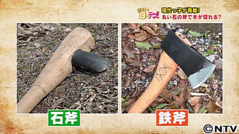 謎を解くカギは、ある道具。それは…石斧と呼ばれる石の斧。実際に日本各地の縄文遺跡から発掘された石の刃を基に復元したものなんですが・・・よく見てみると、石斧の刃は一応尖ってはいるものの全体は太く丸い石のまま。現代の鉄の斧と比べると、とても木を切ることができるように見えません。