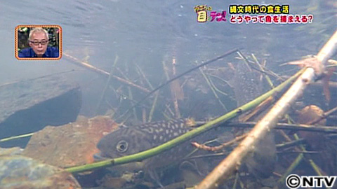 そこで、岡村先生が再現してくれたのは縄文の頃から行われていたという、魚の習性を利用した仕掛け。一見、川に木の枝を刺しただけの、原始的にも思える簡単な仕掛けで、本当に魚を拾うことができるのか?当時縄文人が食べていたとされるイワナを川に放流。5分後…仕掛けの中を見てみると…本当に仕掛けの中にイワナが!水中を見ると、イワナがたくさんひっかかっています。これなら、拾えそう。都丸さんがチャレンジ。現代っ子の都丸さん。生きている魚が怖いそうで、捕まえられません。