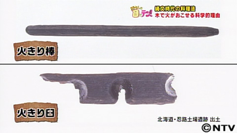 火の起こし方を教わりました。それにしても、一体なぜ木の棒と板だけで火をつけることができるのか?ポイントは、火きり臼に空いている切り込み。実は、この切り込みに科学があったんです。火きり棒と火きり臼をこすり合わせると、摩擦で熱せられた木のクズが削り出されます。この時、外側に切り込みがあることで熱い木屑が一か所に山になって溜まり、熱がこもって温度が上昇。火種が生まれます。あとは、火種を燃えやすい乾いた木の皮の中に入れて、空気を吹き込めば一気に火がつくんです。実際に、同じ形の木が縄文遺跡からも出土しているんです。