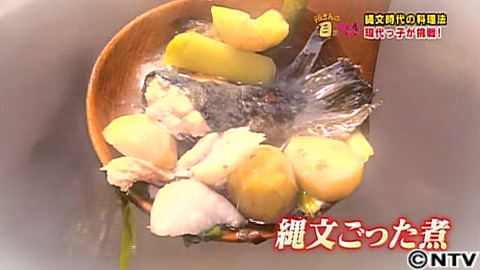 都丸さんが、黒曜石のナイフで切ろうとしたのは、生の魚。なんと、ネット動画の知識で初めてなのになんとか魚をさばけています。その後も、手際よく魚をさばいていく都丸さん…一体どんな料理ができ上がったのか?え?せっかく火を起こしたのに、お刺身?ここで疑問!縄文時代の料理はどんなものだったのか?岡村先生に作ってもらいました。食材を次々にぶつ切りにして、土器で沸かしたお湯の中へ。土器がすでにあった縄文時代では、食材が焼かれた形跡がほとんどなく、基本はお湯で煮ていたと考えられています。今回のように調味料を使わず、食材だけを煮ることも多かったようです。完成したのは「縄文式ごった煮」。