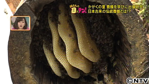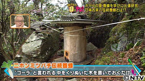 そこで阿部さん、今度は和歌山へ出張研究!やってきたのは、東牟婁郡古座川町。こちらが二ホンミツバチの伝統養蜂を行っている名人の中路さん77歳。名人は山一帯で養蜂をやっているとのこと。中路さんについていくと、指さされた先には、崖の上に置かれた丸太が。一歩間違えば転落の恐れもある急斜面を歩き近づきます。風で倒れないように置かれた重しをどかすと…丸太の中から出てきたのは二ホンミツバチ!巣はセイヨウミツバチで見た木枠はなく、すべてミツバチのロウでできています。