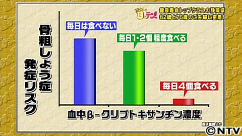 午後3時、畑仕事の合間に休憩です。おやつに食べるのは静岡の特産、温州ミカン。実はミカンにも意外な健康長寿の秘訣が!下方先生によると、「温州ミカンにはβクリプトキサンチンというビタミンAの一種がたくさん入っている。これが骨を丈夫にする効果を持っている」と解説。毎日4個食べると、骨粗しょう症のリスクが大きく減ることがわかっています。