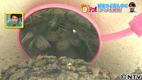 そこで、研究者がよく使う通称ツバメ棒を用意。伸び縮みする棒と自転車用ミラーを組み合わせたもの。ツバメの巣を見つけたらこれで中を観察。先生は、気象庁が2年間観測できなかったのは、数が減ったからで、ちゃんと探せば、まだいるはずと言います。