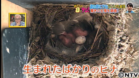 北村先生によると「周りの環境が良いこともありますが、巣を作りやすい構造をしているひさしがあって、土をのっけやすい」とのこと。様々な条件が合うここは、ツバメの楽園になっていたんです。早速、巣の中の観察です。巣にツバメがいない隙を狙い、今回は特別に、巣に近づいて手鏡で直接のぞいてみます。巣には、卵から出てきたばかりのヒナが。子育てが始まったばかりの状況です。オスとメスが交互にヒナにエサをやり協力して子育てをするんです。