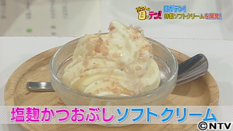 恐るべしソフトクリーム!どんな食材でも難なく受け止める驚異の懐の深さ!目がテン特製新アイスクリーム、塩こうじ鰹節ソフトもまぁまぁいけるのだ!