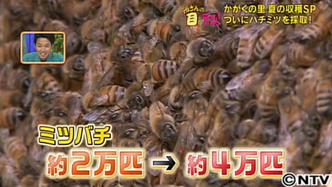 今年から取組み始めたハチミツプロジェクト!5月初めに養蜂がスタート。2週間もすると、1日におよそ2000個もの卵を産むという女王蜂が順調に産卵したようで2万匹だったミツバチは4万匹近くに倍増!巣は超過密状態に。そこで阿部さんが取り掛かったのは、巣の増築!新しい巣板を中に入れ、巣箱の容量を倍にしました!ミツバチの数が増えれば、当然集める蜜の量も増えます。里の畑でもこの季節に咲く花の蜜を集めるミツバチをちょくちょく見かけるように!