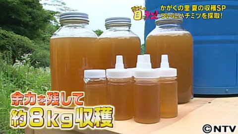慎重に巣版を取り出すと…巣穴に白い蓋がされた部分に糖度80%を超えるハチミツがぎっしり入っているんです。他にも、なるべく沢山ハチミツが採れそうな巣版だけを選び、いよいよ蜜を絞ります。フタがされたままでは、蜜が出ないので、蜜刀というナイフを使い、フタだけを切り落とし、遠心分離機に装着!クルクル回すと絞り終わった巣版は軽くなりました。蜜がなくなった巣版は、巣箱に戻して再利用できるんです。分離機のコックを開けると、大量のハチミツがドバド?バっと。阿部さん、待ちきれず、スプーン一杯分の味見。これで一匹のミツバチが一生のうちに集められる蜜の量。ミツバチにとってはとても貴重なハチミツ。ありがとうございます。最終的に採れたかがくの里第1号のハチミツは余力を残して8kg!秋はどれくらいになるのかな?