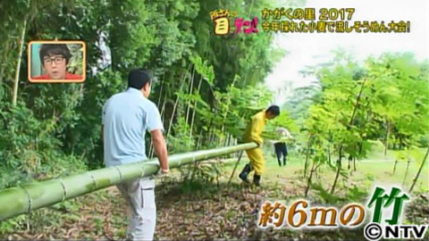 8月上旬。流しそうめん計画のため動き出した阿部さんが真っ先に向かったのは、かがくの里近くにある立派な竹藪!地主の方に許可を頂き竹を切ってそうめんの流し台作り!できるだけ巨大なものを作りたいと考えた阿部さん。切り出したのは、およそ6mの立派な竹!