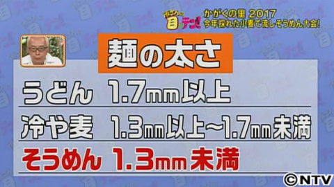 実は、小麦粉を塩水で捏ねて生地にするところまではうどん・冷や麦と全く同じ。違いは太さと、細くする方法!まず太さ。うどんは1.7mm以上。冷や麦は1.3~1.7mmそうめんは1.3mm以下と決まっています。