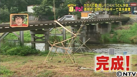 そういえば、川村先生に相談した水の問題。この川の水を流すわけじゃないそうですが、どうするんでしょう?とにかく先生の指示に従いながら竹を組んでいきます。切り出しておいた細い竹3本を支えにし微妙な角度を調整!川の水でリハーサルを繰り返し形ができてきました。作り始めてから3時間…ついに完成!