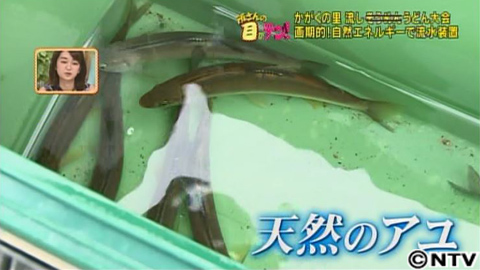 ここで魚養殖の専門家、千葉先生もやってきました!あとはうどんが茹で上がるのを待つばかりですが、その前に地元の方から天然の鮎の差し入れが!実はこの川、鮎釣りの名所。鮎釣り名人の和田さんが釣った鮎を持ってきてくれたんです。