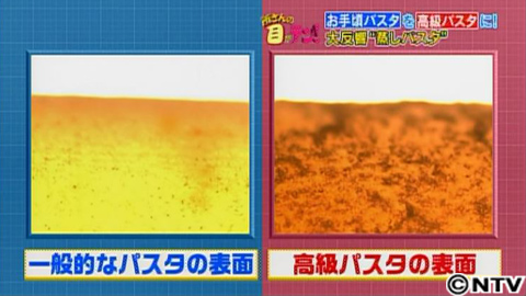 パスタは練った小麦粉を小さな穴から押し出すことで作られます普通のパスタは安定して大量に生産されるためにその出口がすべりのよいテフロンで加工されています。しかし、伝統的な機械で作られる高級パスタは滑りの悪いブロンズを使用。これが理由で、高級パスタは麺の表面がボコボコしているのでソースによくからむんです。そこで、ソースの絡みやすさをみるため茹で上がったパスタに米粒がどれだけくっつくのか?見てみると…高級パスタは、普通のパスタに比べ、4割も多く、米粒がくっついたんです。米粒を並べてみると、一目瞭然!