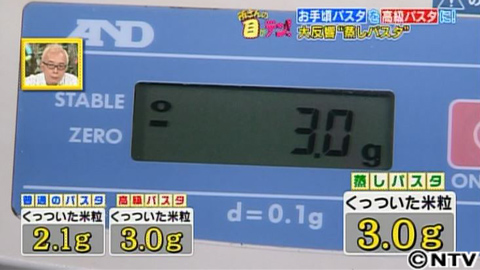 では、蒸しパスタはどうなのでしょうか?同じように、麺に米粒をつけてみると…なんと高級パスタと同じ3g!