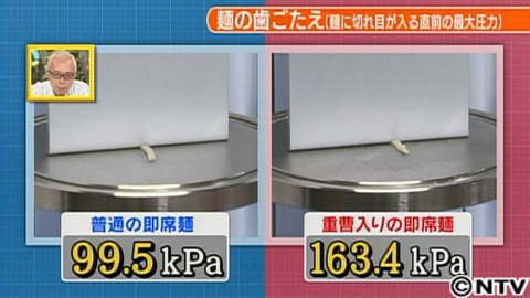 食感を測定できる装置で歯ごたえを測ってみると…重曹を入れた麺は普通に茹でた麺にくらべ6割も歯ごたえが増したんです。
