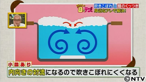 通常、火の位置や鍋の構造から、鍋の中では外向きの対流が起こり、外側に吹きこぼれやすい状況にあります。しかし、小皿を入れることで、対流が乱れ内向きに変わるため、吹きこぼれの原因となる泡が消えやすくなるというんです。