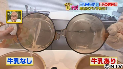 これについて露久保先生は、「牛乳を使うと、乳脂肪分が含まれているので、うまく麺の周りをコーティングしてくっつかないという効果を引き出してくれる」と解説。さらに、牛乳のタンパク質が、鍋の底に薄い膜を貼るので、麺がくっつきにくくなったんです。こうして牛乳で茹でると、茹でた後の麺同士のくっつきも防止。味も変わらないんです!