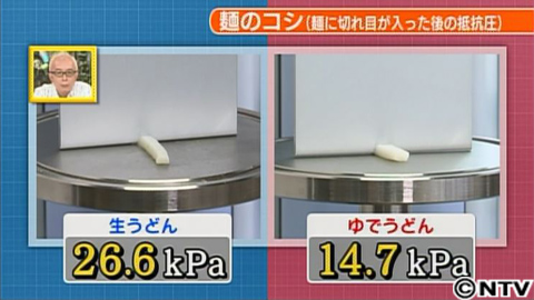 茹で時間も短く済み、値段の手頃な、人気の「茹でうどん」。中には、1食50円以下の格安なものも。しかし、ゆでうどんには“ある気になる点”が…ゆでうどんは、流通の際に品質が変わらないよう麺に水をたくさん含ませているので、コシが弱いんです。うどんに重要なコシ。科学的に数値化することができると言います。