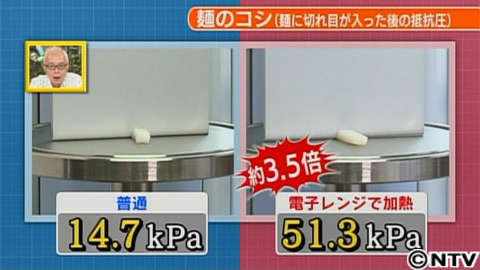 袋から出したうどんを皿にのせ、ラップで包みます。そして、500Wの電子レンジで2分間、加熱。その後…指示通りの時間でゆでます。普通に茹でたものと、電子レンジで加熱してからゆでたものを食べ比べてみると…コシの違いにビックリ!電子レンジで2分加熱し、茹でたゆでうどんでコシを計測します。すると…電子レンジにかける前と比べて約3.5倍もコシがでていたんです!