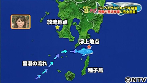 装置が浮上するのは明朝4時。それまでは、放流地点の近くで待機することに。しかし位置情報が示した装置の浮上場所は、放流地点から直線距離で107キロも離れた所。実は、ユウユウは黒潮の流れに乗って種子島の北まで移動していたんです。