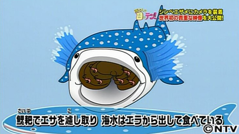 そして今回の撮影した映像にはユウユウの捕食シーンが! 前方からプランクトンのようなものが見えると、上顎を上げて何度も口を開閉させています。海水ごとエサを飲み込んでいます。そして、海水だけをエラから吐き出しているのです。その秘密は口の中にありました。鰓耙と呼ばれる細かいスポンジ状のフィルターがあるのです。ジンベエザメは、鰓耙でエサを濾し取り、海水はエラから出すという食べ方をしています。