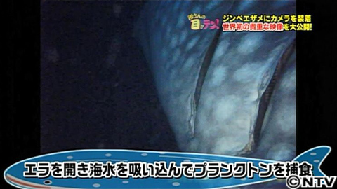 ユウユウは潜行を開始…すると、徐々に増えていく白い物体が!水深300メートルを超すと、吹雪のような状況に!実はコレ、ジンベエザメのエサとなるプランクトンを含む細かい粒子の層。胸ビレのカメラには、エラを開いて口の中に海水を吸い込んでいることが確認出来ます。深く潜ってプランクトンを食べている証。