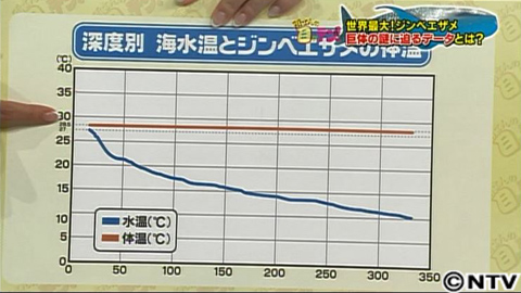 さらに、今回もう1つ重要な発見がありました。実は今回ずっとユウユウの「体温」を測っていたんです。海水温は表層付近で27.4度だったのが、水深が深くなるにつれて、徐々に低くなり今回の最深部329メートルでは10.4度を記録。その差は17度もあったんです。一方、ユウユウの体温はと言うと、28.5度からほぼ横ばいでほとんど変化はなかったのです。