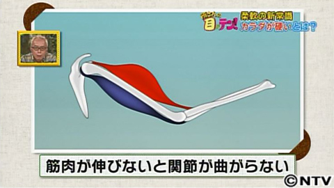 荒川先生によると、そもそも体が硬いというのは…関節の動く幅が狭いということ。筋肉が骨と骨の間に筋肉が付着していてその筋肉が伸びなくなると関節の動きが制限される状態。ヒトは筋肉を収縮させることで関節を動かしています。しかしその時、縮む筋肉に合わせて反対側の筋肉がちゃんと伸びないと関節が曲がりにくくなってしまいます。つまり関節を動かす筋肉の伸び縮みが悪いのが、体が硬いということ。