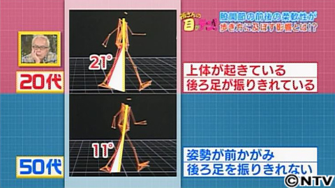 これは股関節が硬くなっているから。普段あまり意識しない、股関節の固さ。日常の動きにどんな影響を与えているのでしょうか?体の主要な箇所にマーカーをつけモーションキャプチャーで分析してみました。荒川先生は、「歩く」というごく基本的な動作にも大きな影響があるといいます。20代と50代の女性を比較してみた結果…20代の場合、歩く時、上体がまっすぐになっており、股関節も軟らかいので足を後ろにしっかり蹴って大きく振るように歩いています。蹴りきった後ろ足と、体の中心軸が作る角度は21度でした。一方、50代の方は、歩くとき前かがみになっていて、さらに、後ろ足と体の中心軸の角度が11度と小さく、足をしっかり蹴れていないことが分かりました。