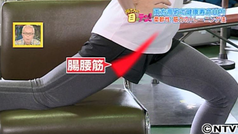 股関節の筋肉が衰えていた先ほどの50代の女性たち。いったいどうすれば改善するのでしょうか?そこでまず、先生が教えてくれたのが、背もたれのあるイス1つでできる効果的なストレッチ!まずは、足を後ろに振っている側の股関節の前側を伸ばすようにします。この時に伸びているのが腸腰筋。