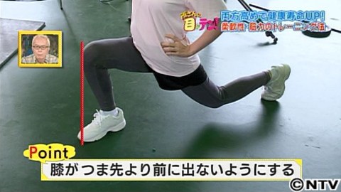 この筋肉が伸びると足が前に出やすくなるそうです。こちらも左右両方、それぞれ30秒程度行ってください。さらに荒川先生は、ストレッチ効果のあるオススメの筋トレ「ランジ」も紹介してくれました!
