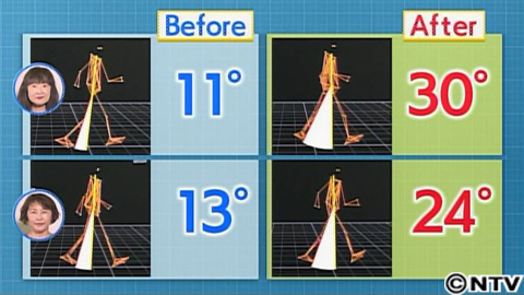 他にも、コーヒーを飲みながら、テレビを見ながらなど「ながらストレッチ」もおすすめだそうです。そこで、歩きが衰えていた50代の女性2人に2週間、暮らしの中でできる筋トレとストレッチをやってもらいました。そして、2週間後。股関節の柔軟性に変化は出たのか?二人とも、改善した実感はあるようなのです。では実際に、データで比較するとどうなのか?実際に歩く動作を測定したところ・・・2週間前よりも、後ろ足が後方に振られる角度がアップしていました。